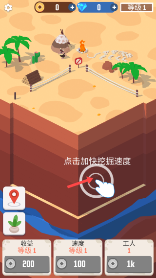 1、在游戏初始界面,按照【箭头】指示,点击目标位置,加快挖掘速度,获取资源。