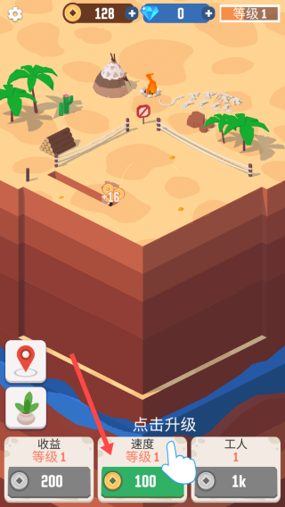 2、当资源积累到一定程度,点击【箭头】所指的【速度】升级按钮,花费资源提升挖掘速度属性。
