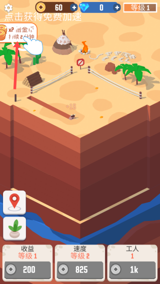 3、根据游戏提示,点击对应位置获取免费加速等增益效果,进一步提升挖掘效率和游戏收益。