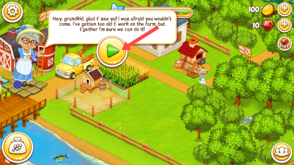 1、出现奶奶对话的界面时,点击绿色的播放按钮进行对话,可以推进游戏剧情或任务指引。