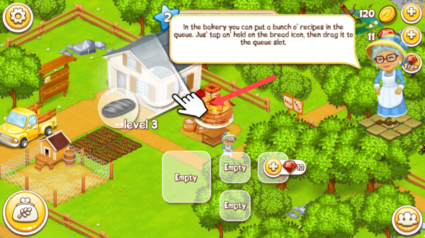 3、在面包房的界面,按照提示按住面包的图标并拖到队列槽,可将食谱放入队列进行制作。