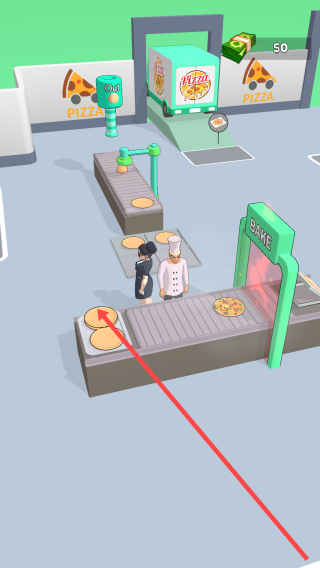 1、进入游戏,操控角色在披萨车附近收集钱币,熟悉基础操作,为后续经营积累初始资源。
