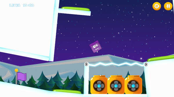 2、面对【LEVEL19】,注意紫色方块飞行路径,避开下方电网,借助三个橙色装置的动力调整方块轨迹,确保安全通过。