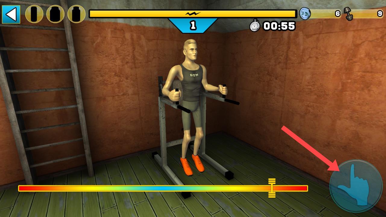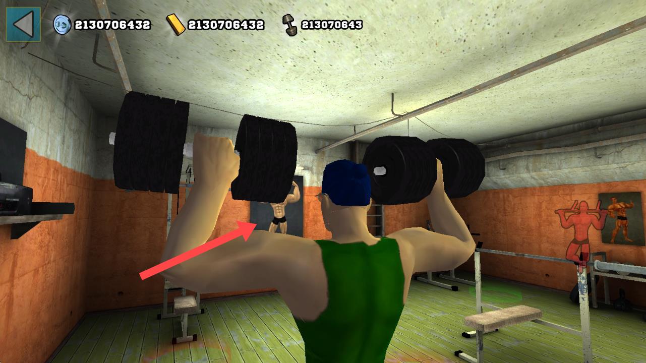 2、游戏中途,玩家根据健身计划,在杠铃架、跑步机等器材间切换,观察身体变化,逐步提升训练强度。