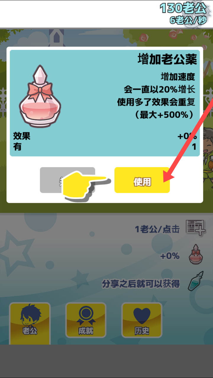 3、出现了【增加老公药】的界面时,你需要点击【使用】按钮,来提升获取老公的速度。