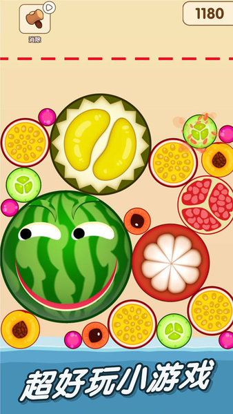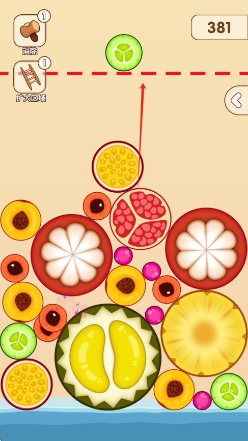 2、水果不停地合成,堆积,堆到箭头所指的虚线的时候,游戏会结束。