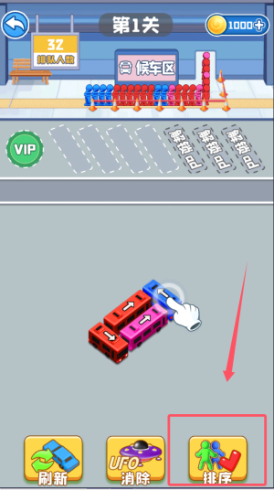 1、观察停车场布局,找出可移动的车辆,点击将其移至候车区。