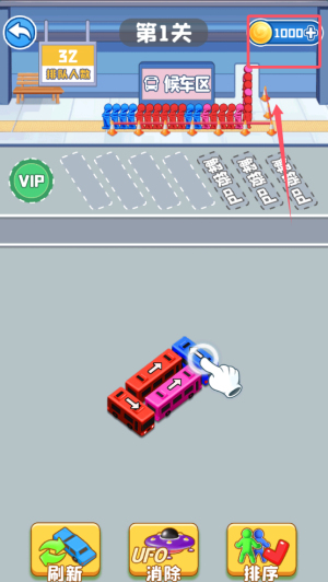 2、匹配乘客与车辆,确保颜色和数量相符,坐满后车辆自动驶离。