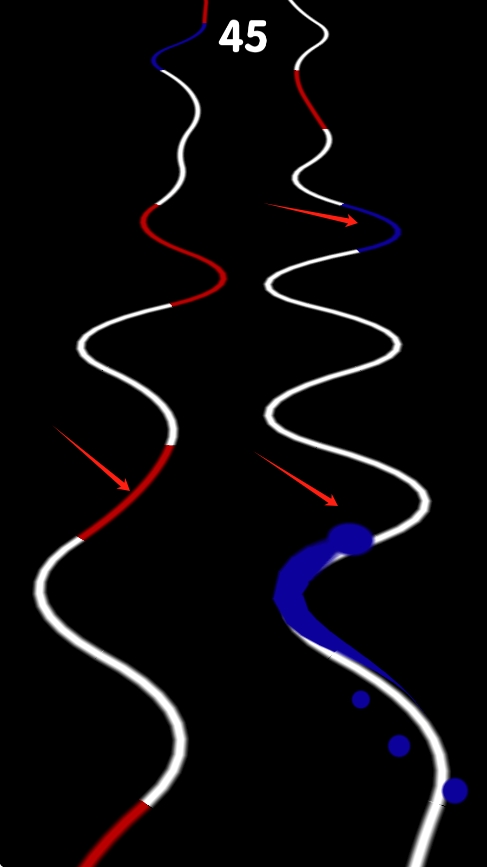 2、双线切换机制:赛道由上下两条平行曲线组成,玩家通过点击屏幕切换小球所在轨道,蓝色小球仅能在蓝色曲线上安全移动,遇到红色的曲线需及时切换轨道。