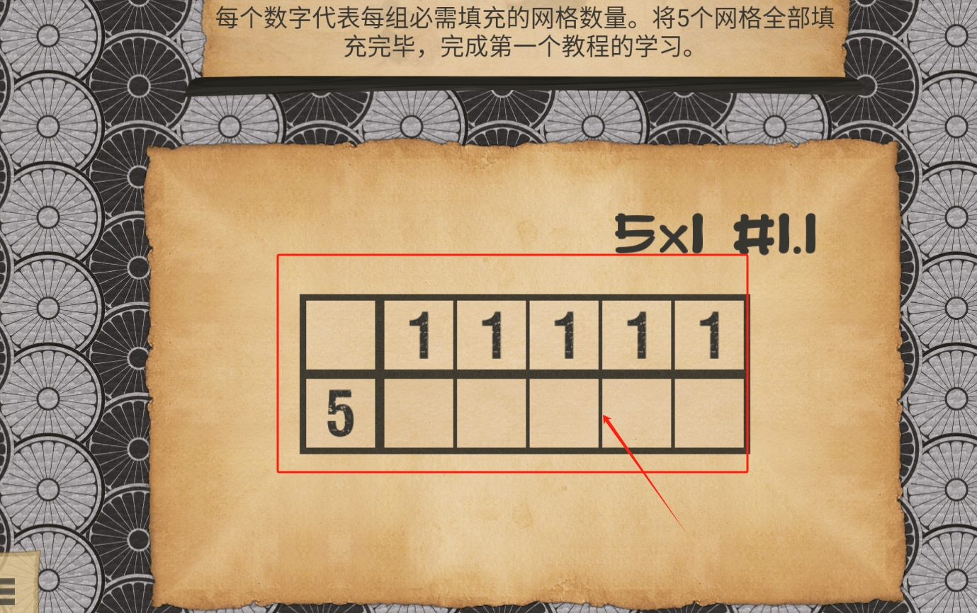 1、依据网格旁数字提示,如5×1#1.1中的数字,填充相应数量网格完成教程。