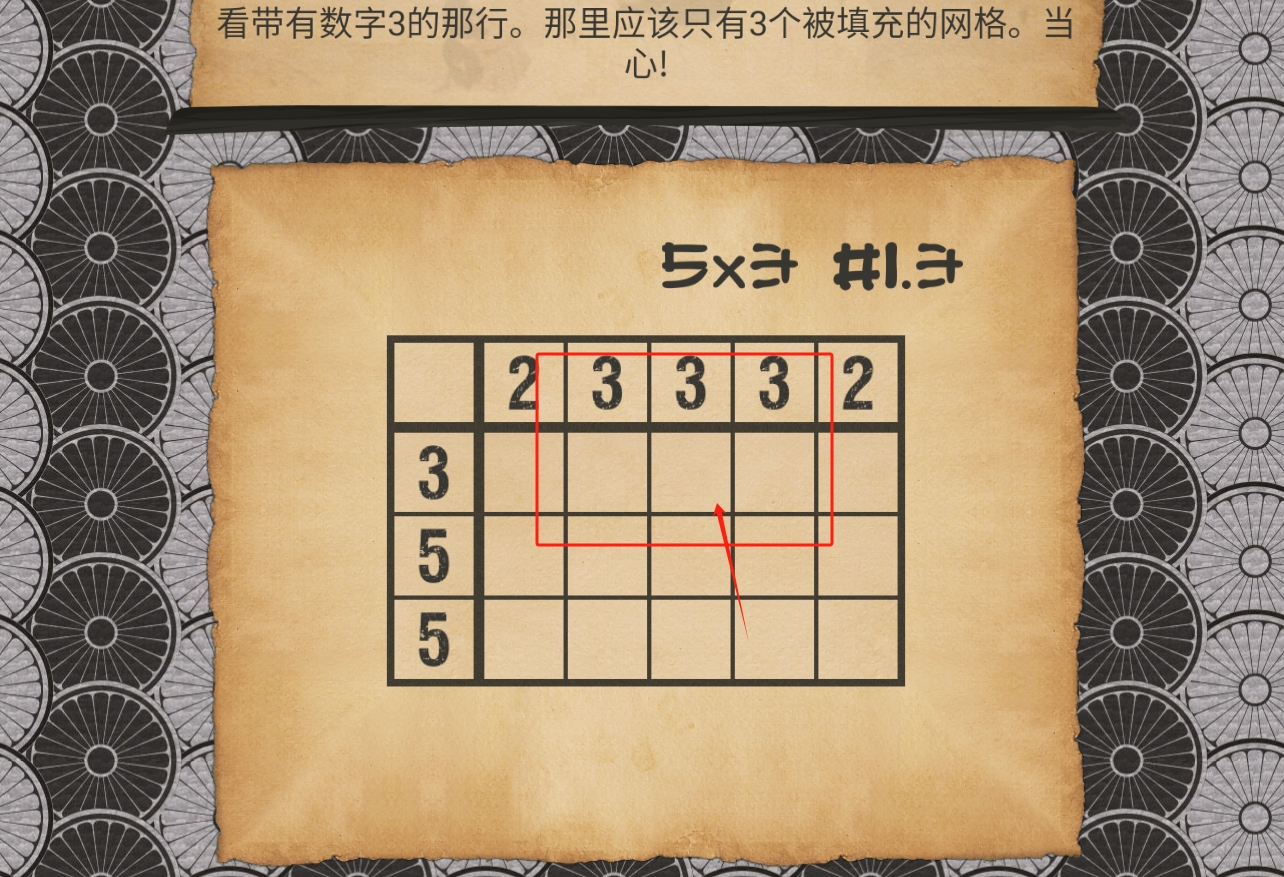 3、面对如5×3#1.3中数字3所在行,精准把控填充数量,仅填充3个网格,避免出错。