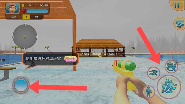 1、移动射击对战对手:使用操纵杆控制角色在水池场景移动,点击屏幕右侧按钮瞄准射击,通过灵活走位和精准射击击败其他玩家,争取胜利。