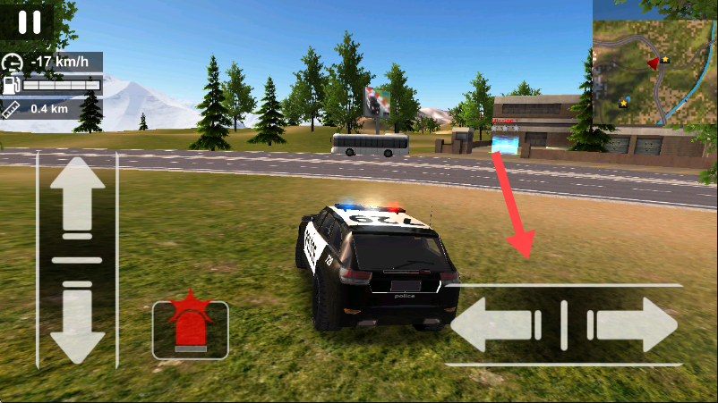 2、在游戏场景中,通过左侧的上下箭头按钮控制警车的前进与后退,调整车辆移动速度。