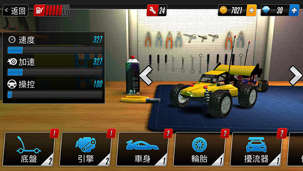 2、部件升级强化性能:使用比赛奖励对车身轮胎引擎等部件进行升级,提升赛车速度稳定性,应对更高难度的赛道与对手。