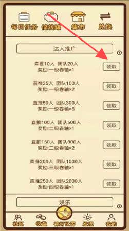 2、在游戏界面中,找到“达人推广”区域,点击【领取】按钮获取对应推广奖励,如直推一定人数可领卷轴等,助力游戏进程。