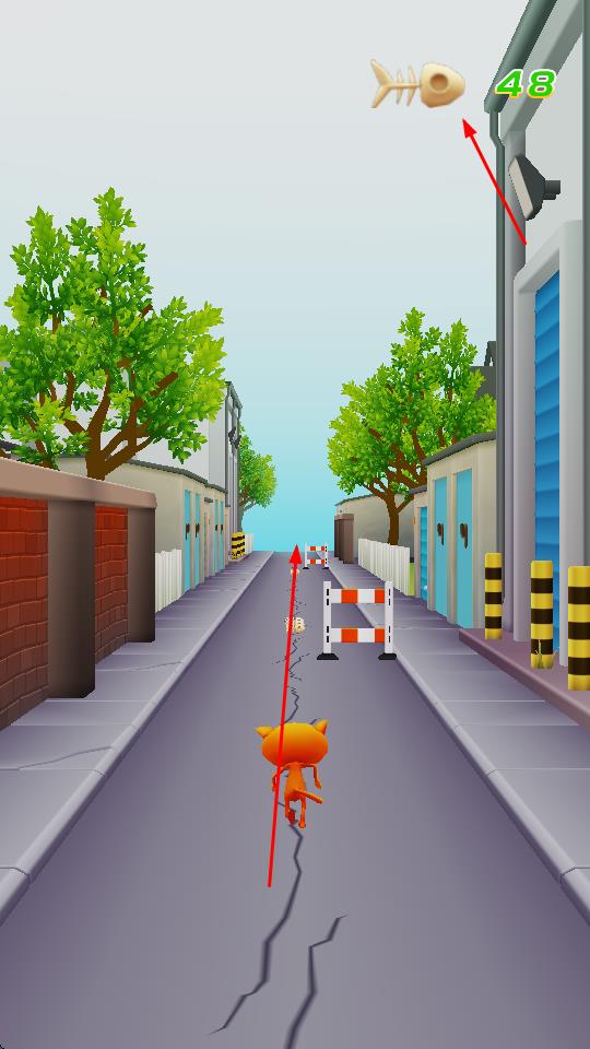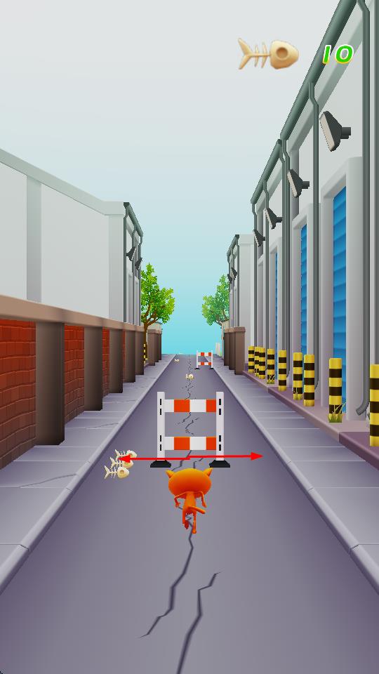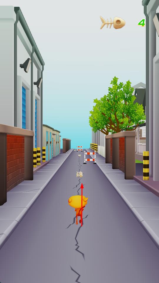 1、简单触屏操控:玩家通过简单的触屏操作,控制小猫进行跑酷前进,躲避前方的各种障碍,收集鱼骨头道具获得分数。