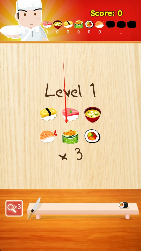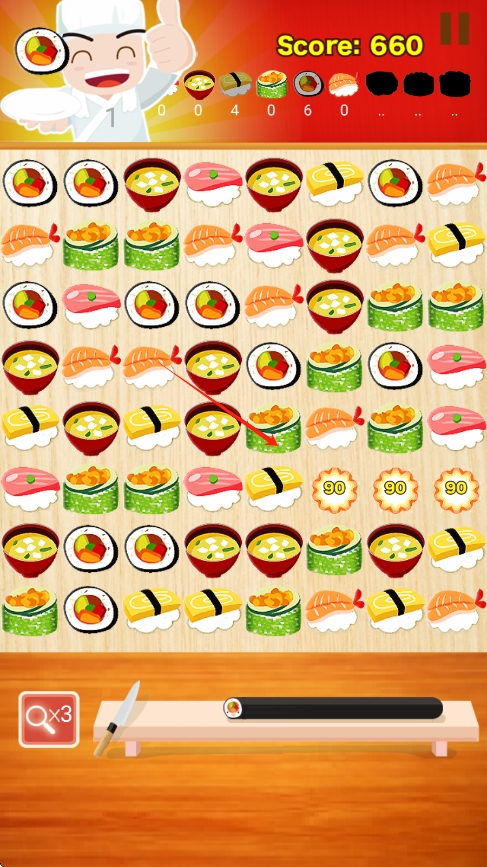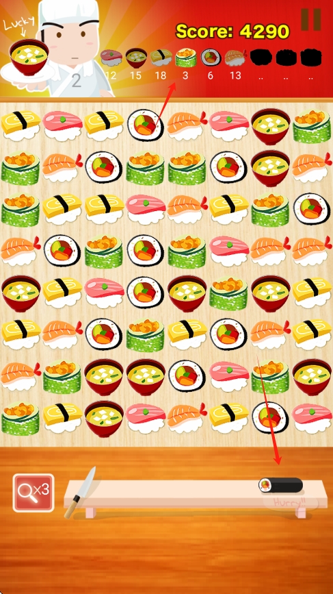 3、最上方会显示我们还差多少数量的食材,最下方的寿司会满满变短,消除则会增加一些时间,要注意时间。