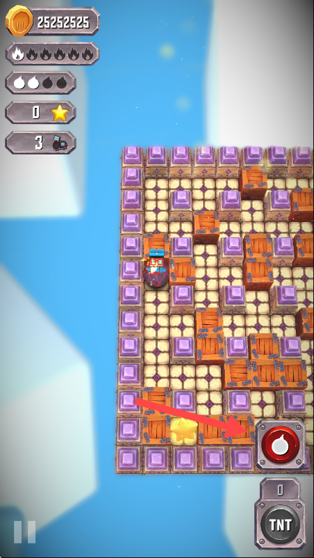 3、游戏过程中,点击右下角红色按钮放置炸弹,清除障碍并获取星星,完成关卡目标。