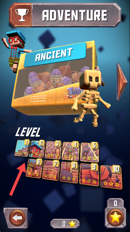 2、在冒险模式关卡选择界面,点击箭头所指的关卡图标,进入对应关卡。