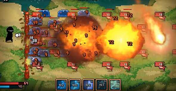 3、利用技能产生的爆炸效果攻击怪物,关注伤害数值等,应对大量怪物时注意自身血量。