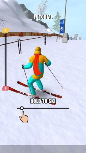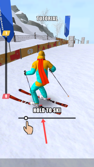 1、在滑雪游戏教学关卡中,按照【箭头】所指和提示“HOLDTOSKI”,按住指定位置,操控角色开始滑雪。
