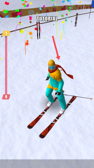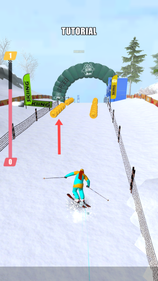 2、在滑雪过程中,依据【箭头】指示方向,引导角色滑行并穿过赛道上的目标道具。