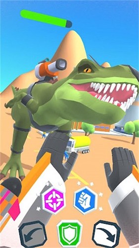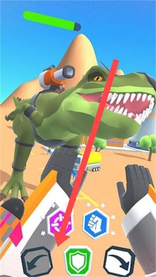 2、遭遇绿色恐龙机器人时,留意箭头指向的技能按钮,及时点击以应对攻击,熟悉战斗节奏与技能使用。
