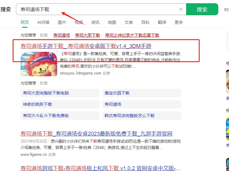 1、在网站上搜索寿司道场下载,并点击图片标记的链接进去下载。