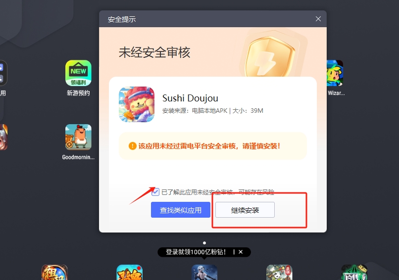 3、将我的寿司道场apk拖入到雷电模拟器,点击已了解此应用,再点击继续游戏即可进入游玩。