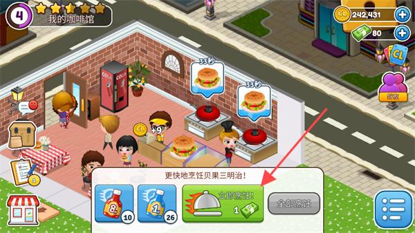 1、经营咖啡馆时看到【更快地烹饪贝果三明治!】提示点击【立即烹饪】或【全部烹饪】提升出餐速度。