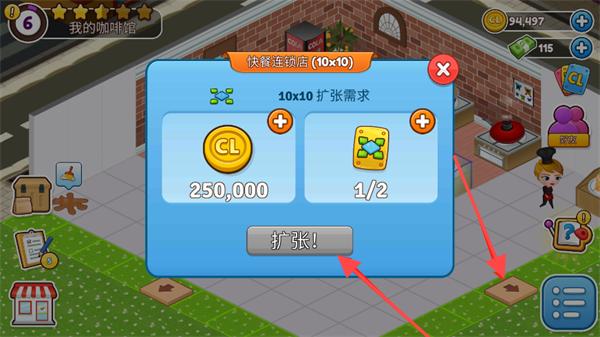 2、咖啡馆出现【10x10扩张需求】时备好250,000金币和所需地块后点击【扩张】扩大经营规模。
