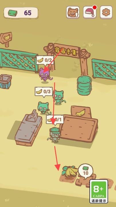 1、玩家在猫猫市集场景中操控角色,收集香蕉等物品,满足不同小猫的需求。