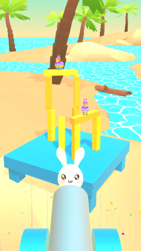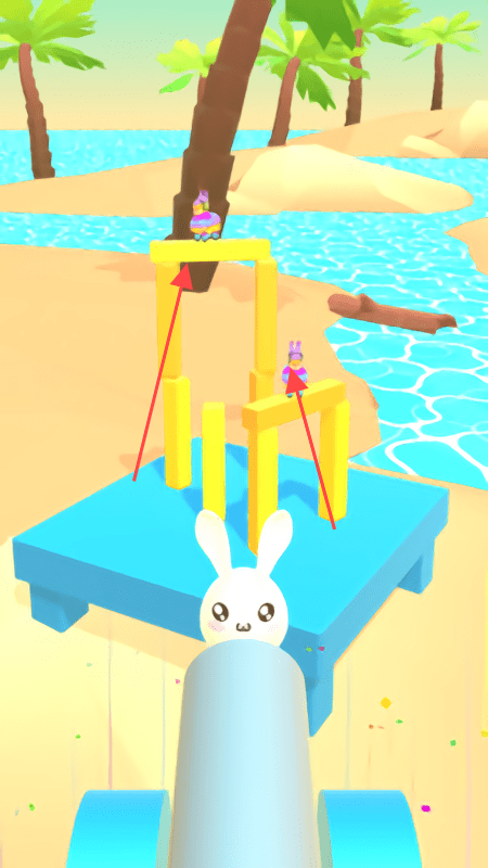 1、玩家操控白色兔子角色,从炮筒装置发射出去,向搭建的黄色框架结构前进。