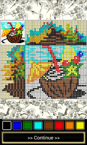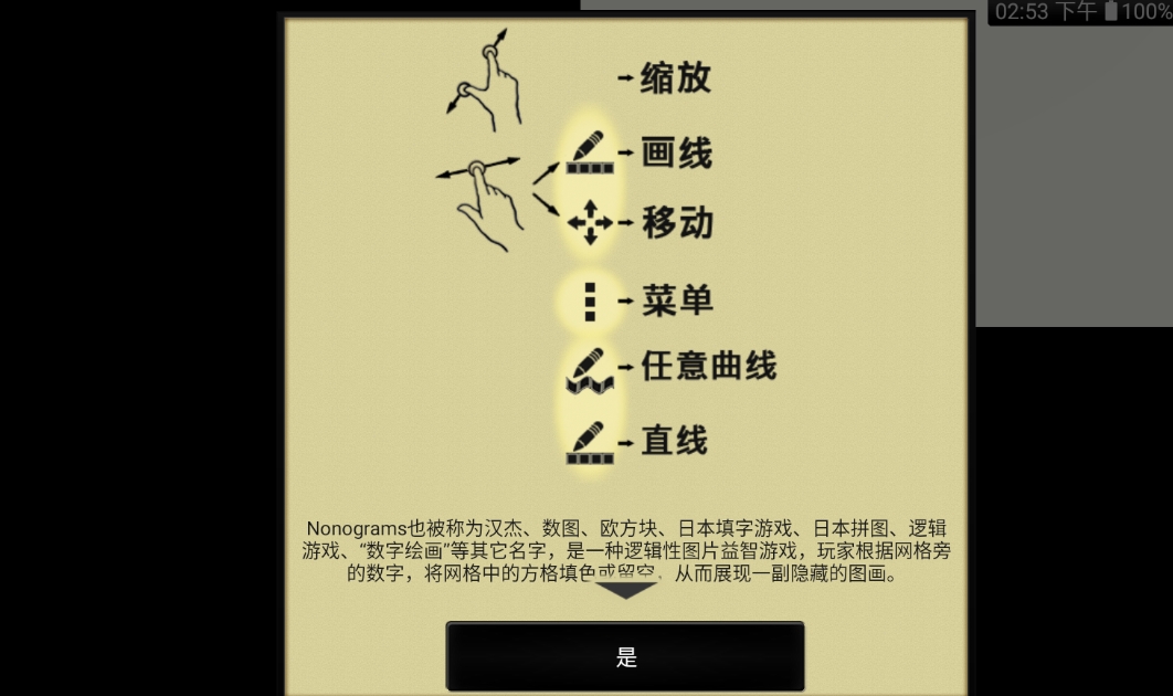 3、了解缩放、画线等操作手势,依据网格旁数字,填色或留空方格以展现隐藏图画。