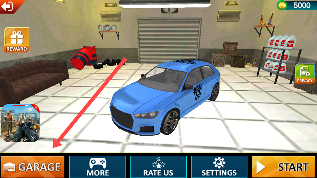1、进入游戏后,点击左下角的GARAGE进入车库,即可对车辆进行改装。