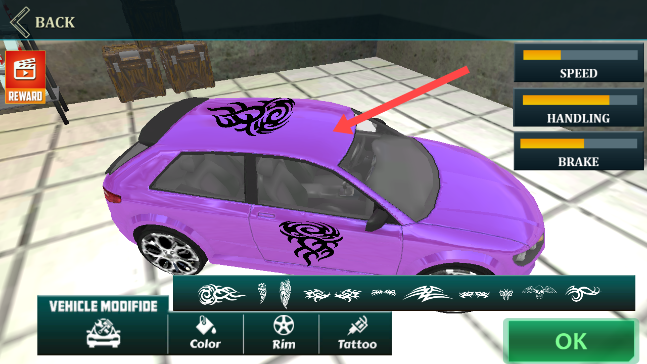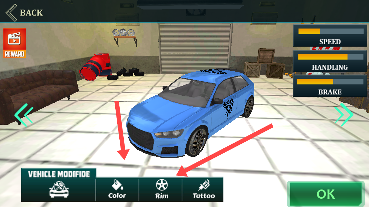 3、多种配件和颜色可供选择,改装完成点击OK回到主界面即可开始游戏。