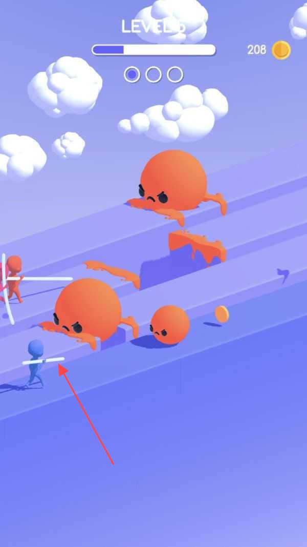 2、操控蓝色小人持杆前进,留意【LEVEL2】进度条,躲避橙色怪物,确保顺利推进关卡。
