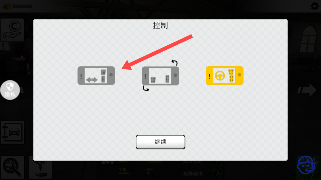 1、进入游戏后,先选择一个操控模式,按键模式,重力感应模式和方向盘模式可供选择。