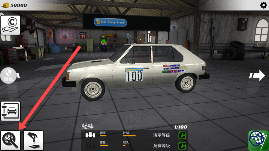 2、进入车库后点击左下角的齿轮图标进入改装界面,右侧可选择颜色。