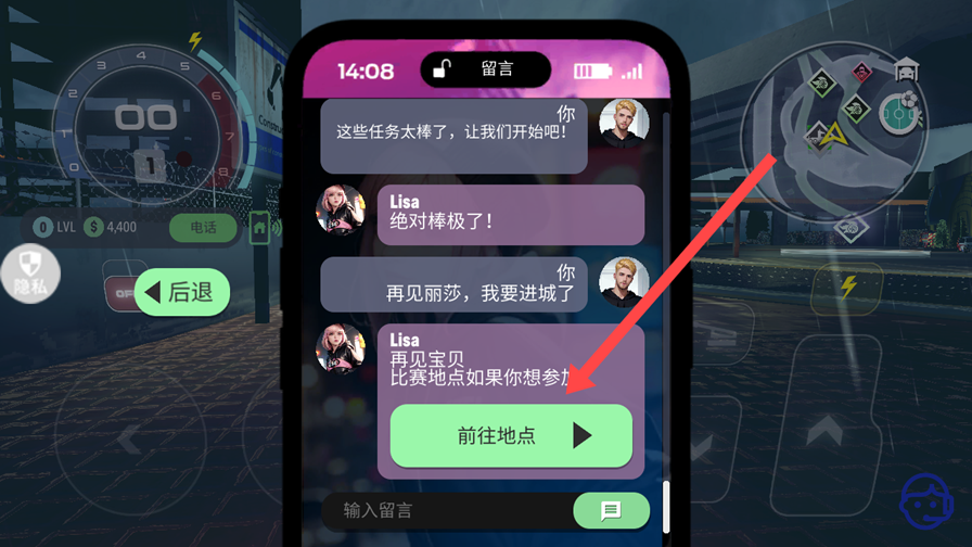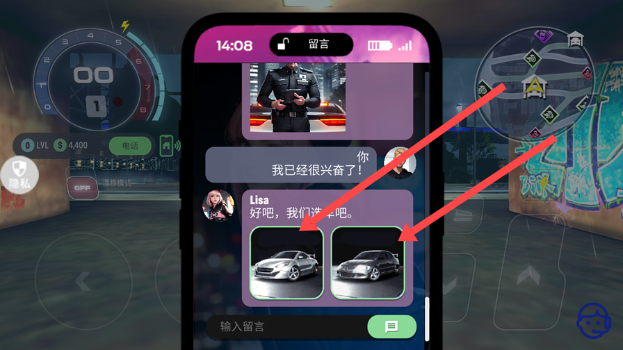 1、进入游戏后会有个手机聊天对话剧情,等待对方提示,选择车辆后进入游戏。