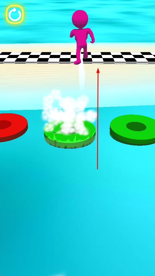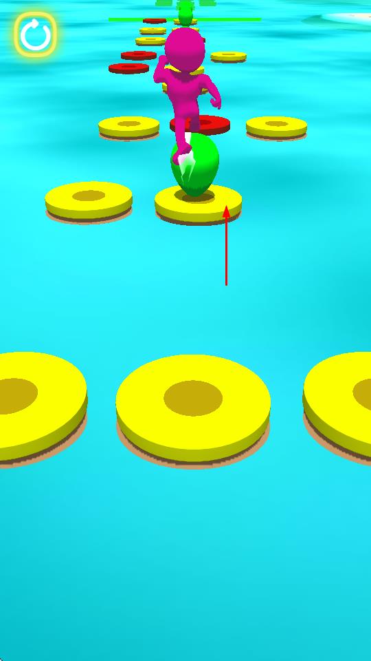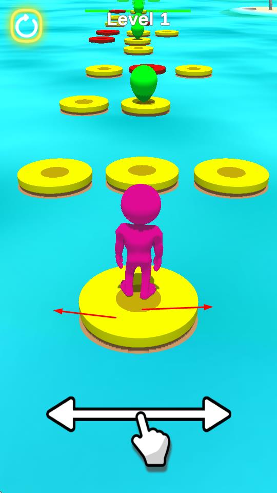 1、玩家操控紫色小人在水面上的圆形平台间移动,通过左右滑动屏幕控制小人横向位移。