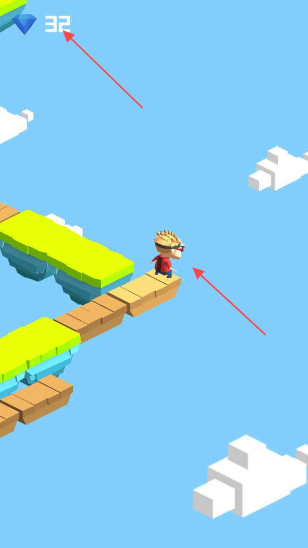 3、在前进的过程中,收集钻石【如图中显示32】,同时按箭头指引操控角色在平台上稳步前行,避免失误。
