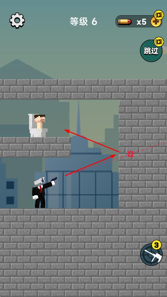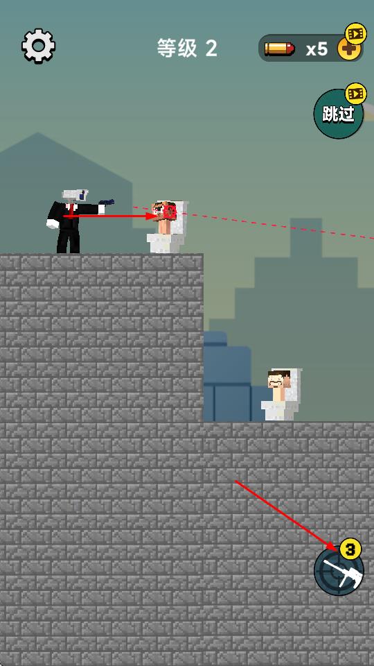 1、玩家操控持枪角色,通过射击消灭场景中坐在马桶上的敌人,完成关卡任务。