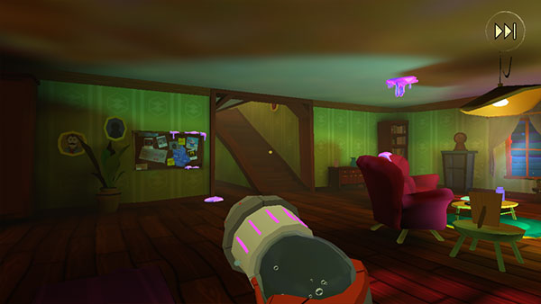 2、探索过程在不同房间移动,利用多功能工具消除紫色黏液、解开谜题,同时警惕暗处随时可能出现的怪物。