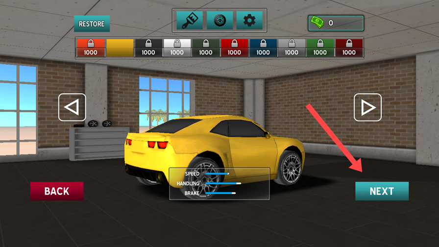 2、这里可以选择车辆和进行改装,完成后点击NEXT下一步正式开始驾驶比赛。