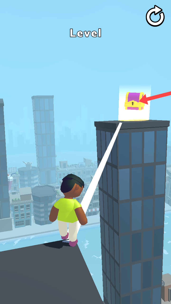 1、在进入游戏界面中,你需要观察到高楼顶部的宝箱,这是本关目标,操控角色向其靠近。