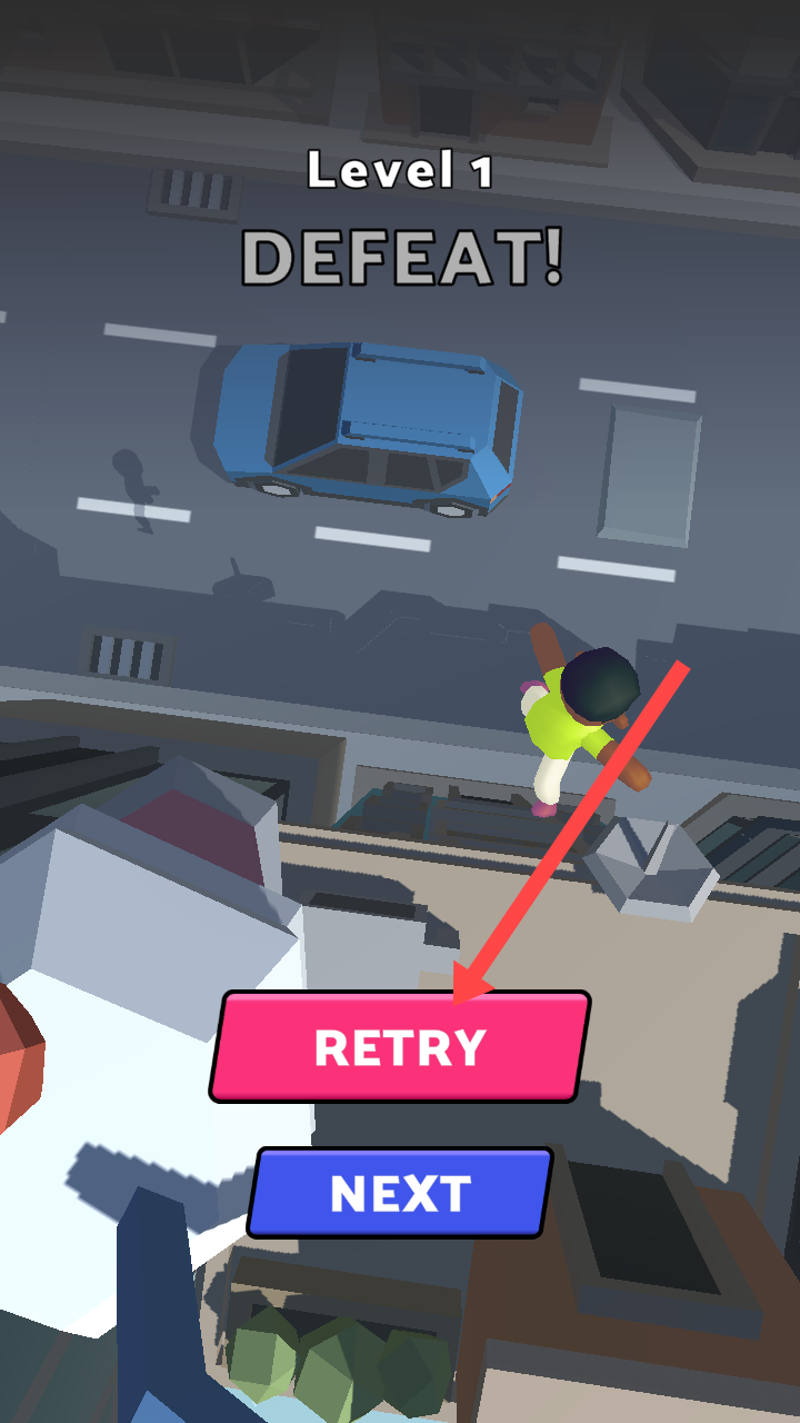 3、若挑战失败出现DEFEAT界面,点击【RETRY】按钮,重新尝试当前关卡,积累经验直至成功。