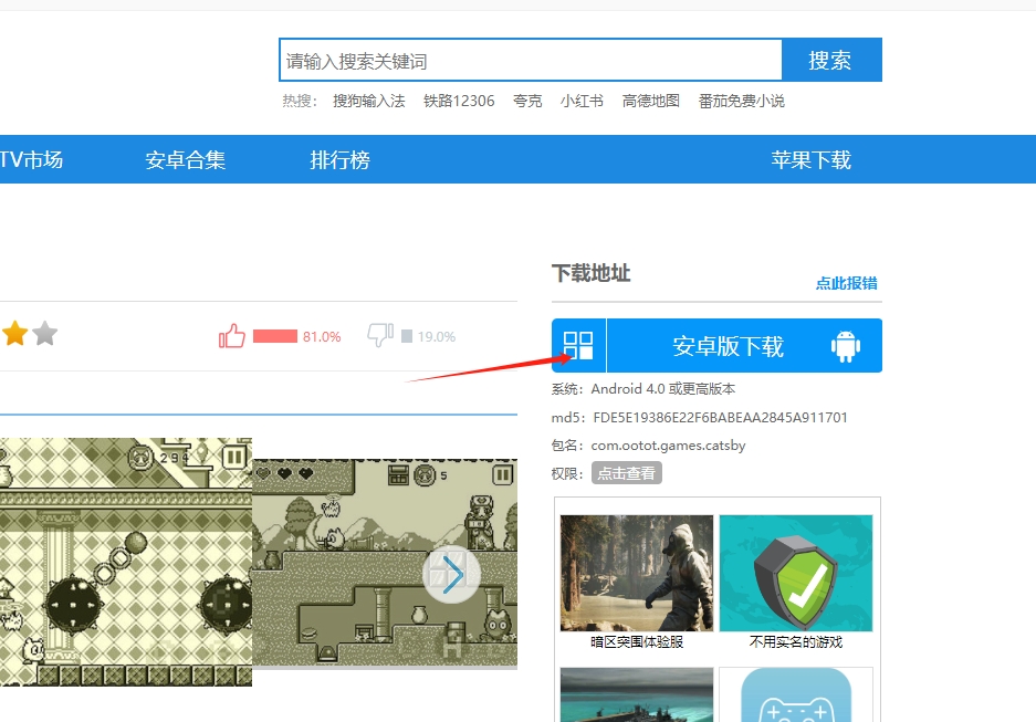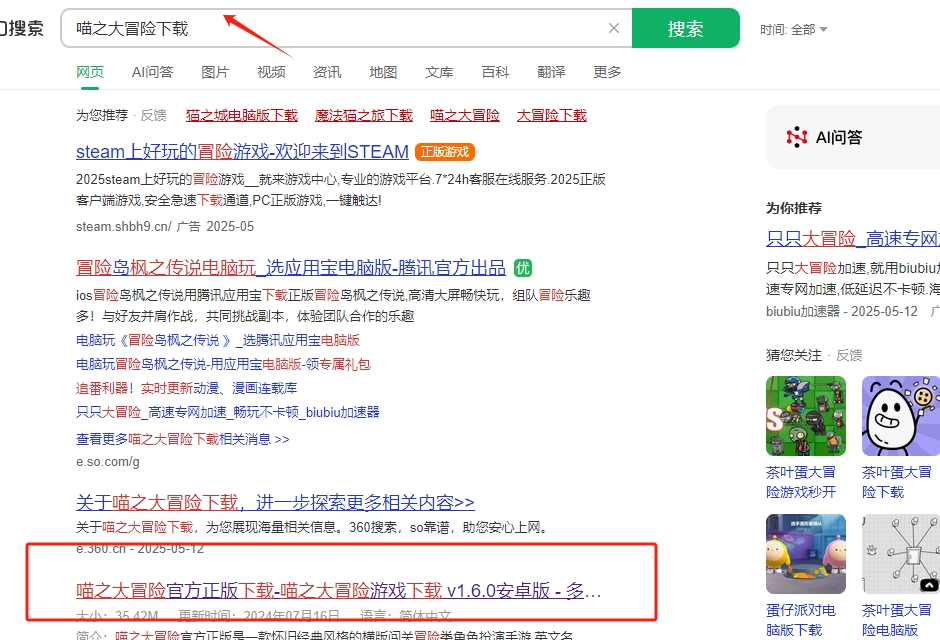 1、在网站上搜索喵之大冒险下载,并点击图片标记的链接进去下载。