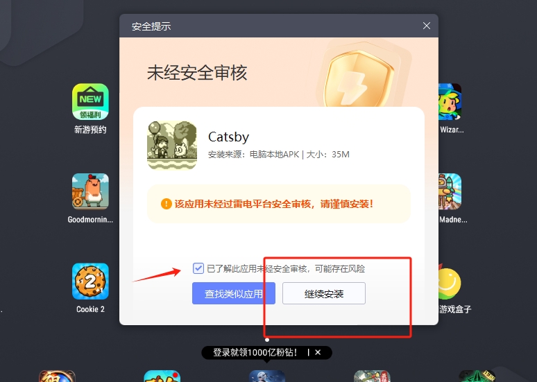 3、将喵之大冒险apk拖入到雷电模拟器,点击已了解此应用,再点击继续游戏即可进入游玩。