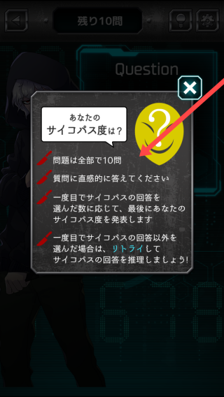 2、注意游戏提示,本次测试共【10問】,需凭直觉回答,根据选择的サイコパス回答数量最终判定结果。